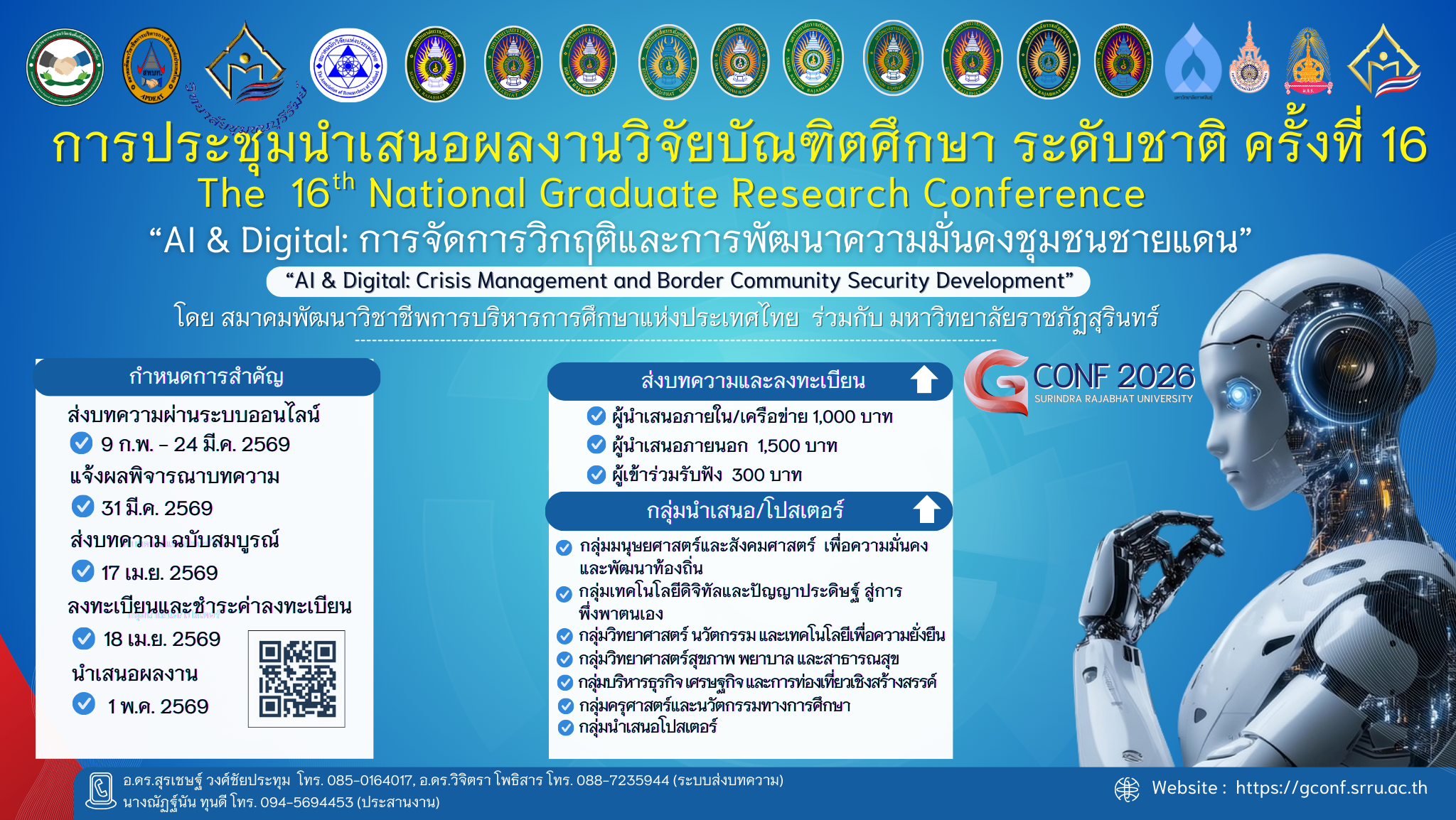 การลงทะเบียนส่งบทความ การประชุมวิชาการเสนอผลงานวิจัยระดับบัณฑิตศึกษา ระดับชาติ ครั้งที่ 15 https://gconf.srru.ac.th/signup.php